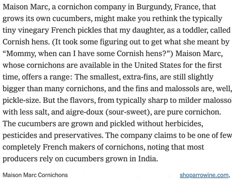 Arrowine's Maison Marc Cornichon: Featured in The New York Times
